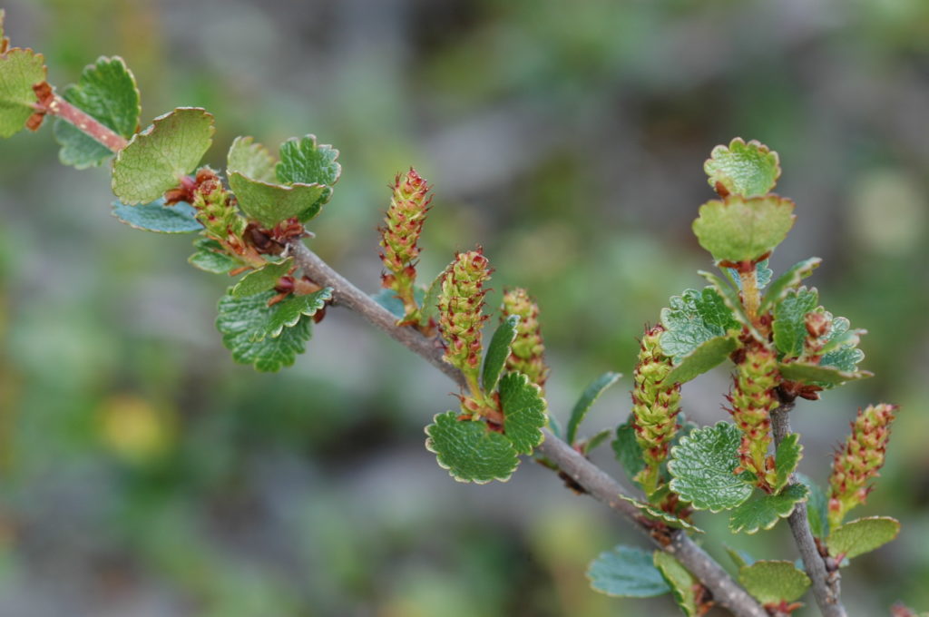 You can recognize the dwarf birch on its hairy twigs. Its leaves are dark green but turn red in the fall. The leaves have been used as painkillers – especially to relieve stomachache.