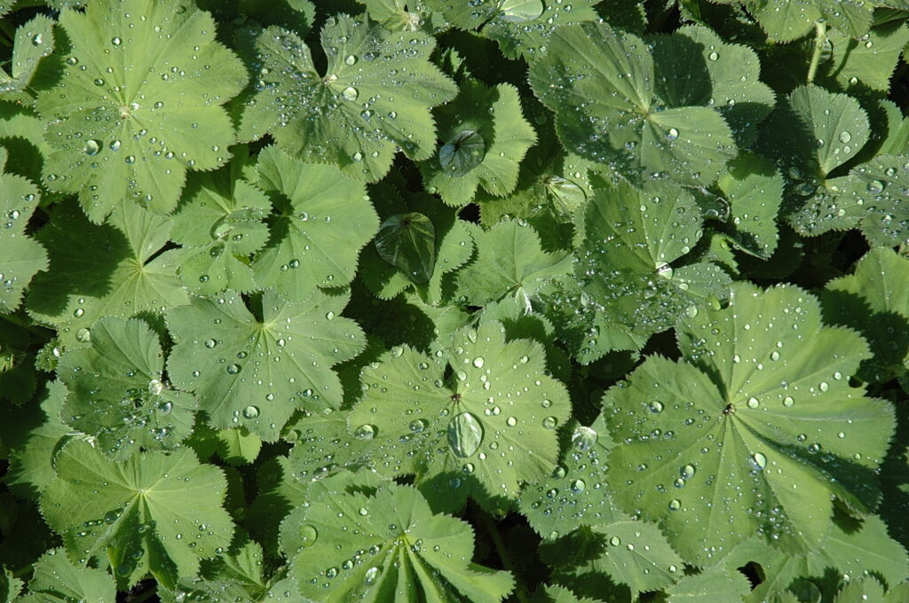 The alchemists were a group of men who in the Middle Ages tried to produce gold from base metals. They were chemists and mystics at the same time. The plants commonly known as “lady’s mantle” have the genus name Alchemilla, which is related to the word “alchemy”. The alchemists believed that the drops of water from dew and rain that collected on the leaves of the Alchemilla plants were very pure and “noble”, and thus suitable as an ingredient in the production of gold.