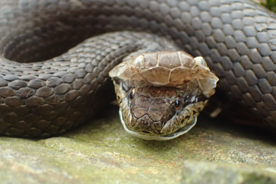 The smooth snake is so named after the smooth scales on it’s back. The European grass snake and the Northern viper both have keeled scales on their back, making them appear and feel more rough. This is also visible on snakeskin which has been shed. If you look for the keel, it is possible to determine whether it is a smooth snake’s snakeskin or one of the two other species mentioned. If there is a narrow ridge on each scale, then it is not a smooth snake.